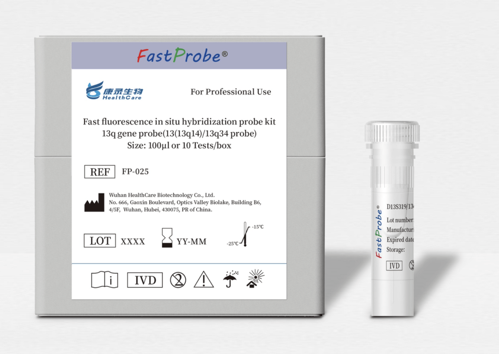 13q14/13q34 is a dual-color hybrid probe. The orange-red fluorescent dye directly labels the D13S319 probe and the probe specifically detects the D13S319 gene at 13q14.2. The green fluorescent dye directly labels the 13q34 probe, which specifically detects LAMP1 gene in the 13q34 region.
