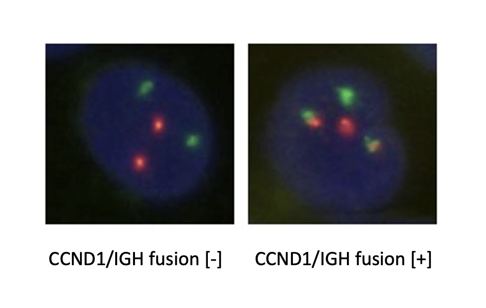 CCND1/IGH dual-color fusion probe is used to detect t(11;14) (q13.3; q32.3) translocations in up to 95% of mantle cell lymphomas (MCLs). At the same time, t(11;14) is also present in other lymphoproliferative diseases, such as juvenile lymphoblastic leukemia (PLL) and plasma cell myeloma.